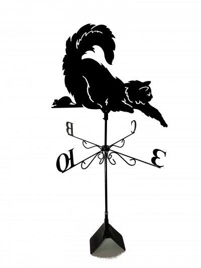 Флюгер "Кошка" служит для указания направления ветра, используется как декоративный элемент для украшения дома. Флюгер снабжен креплением для установки на конек крыши. Лопасть изготовлена из стального листа толщиной 2 мм. Легкое вращение обеспечивает шарикоподшипник, расположенный в верхней части опоры. Изделие окрашено черной атмосферостойкой краской.