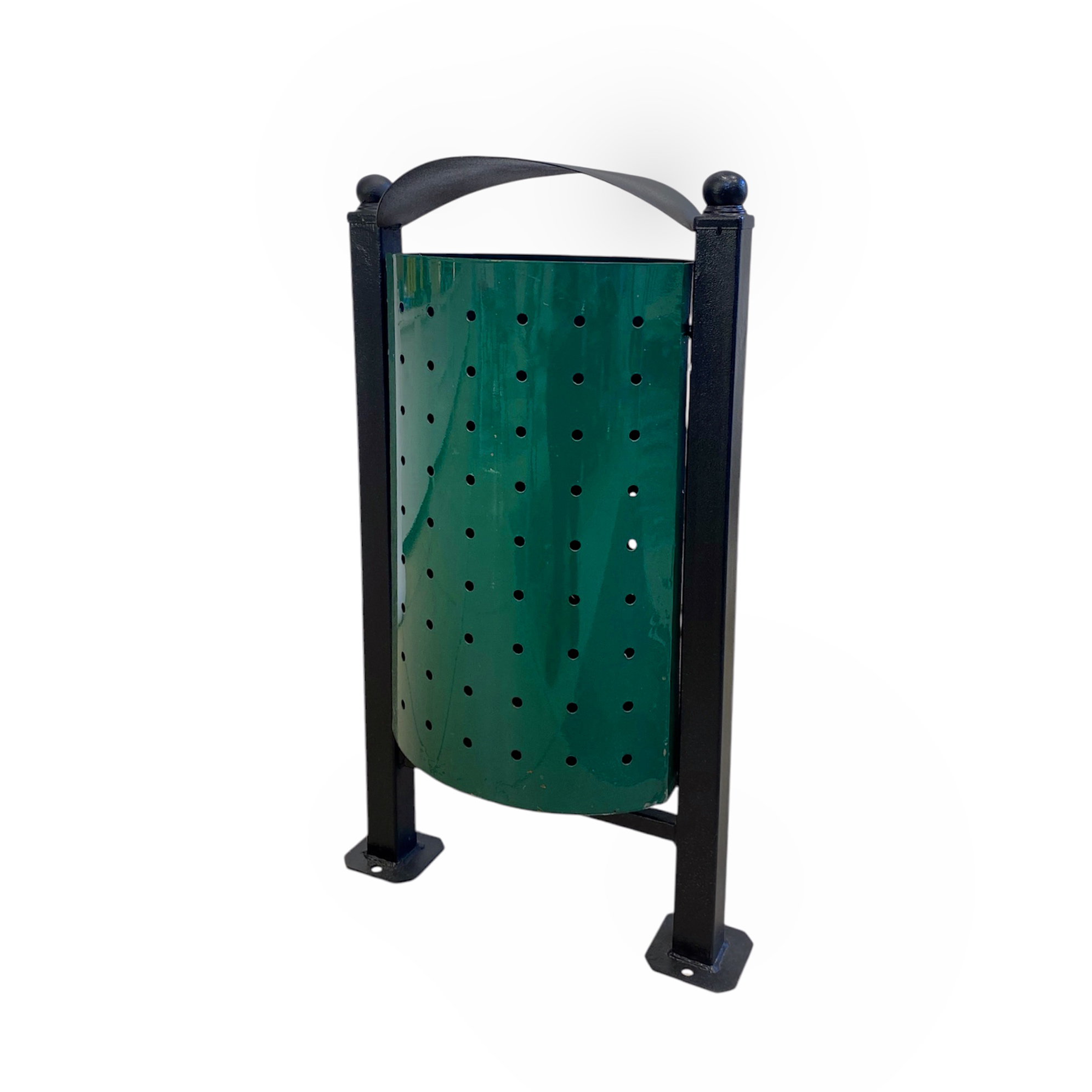 Урна с качающимся баком на основании, которое крепиться к поверхности с помощью анкеров. Овальный бак изготовлен из стального перфорированного листа толщиной 1мм, высоту 480мм, объем бака 30 литров. Урна украшена декоративными коваными элементами. Для защиты от осадков предусмотрен козырек. Цвет урны - зеленый, цвет каркаса - черный.