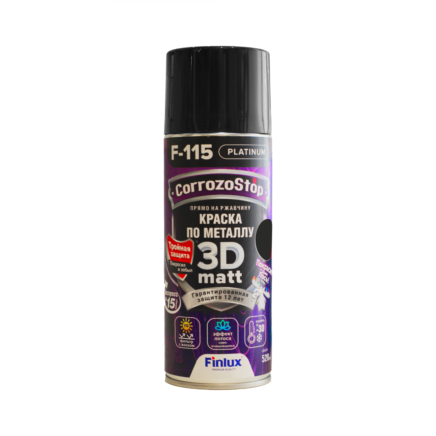 Finlux F-115 3D matt Грунт-эмаль 3в1 антикоррозийная RAL 9005 (черный, мат) аэрозоль 520мл