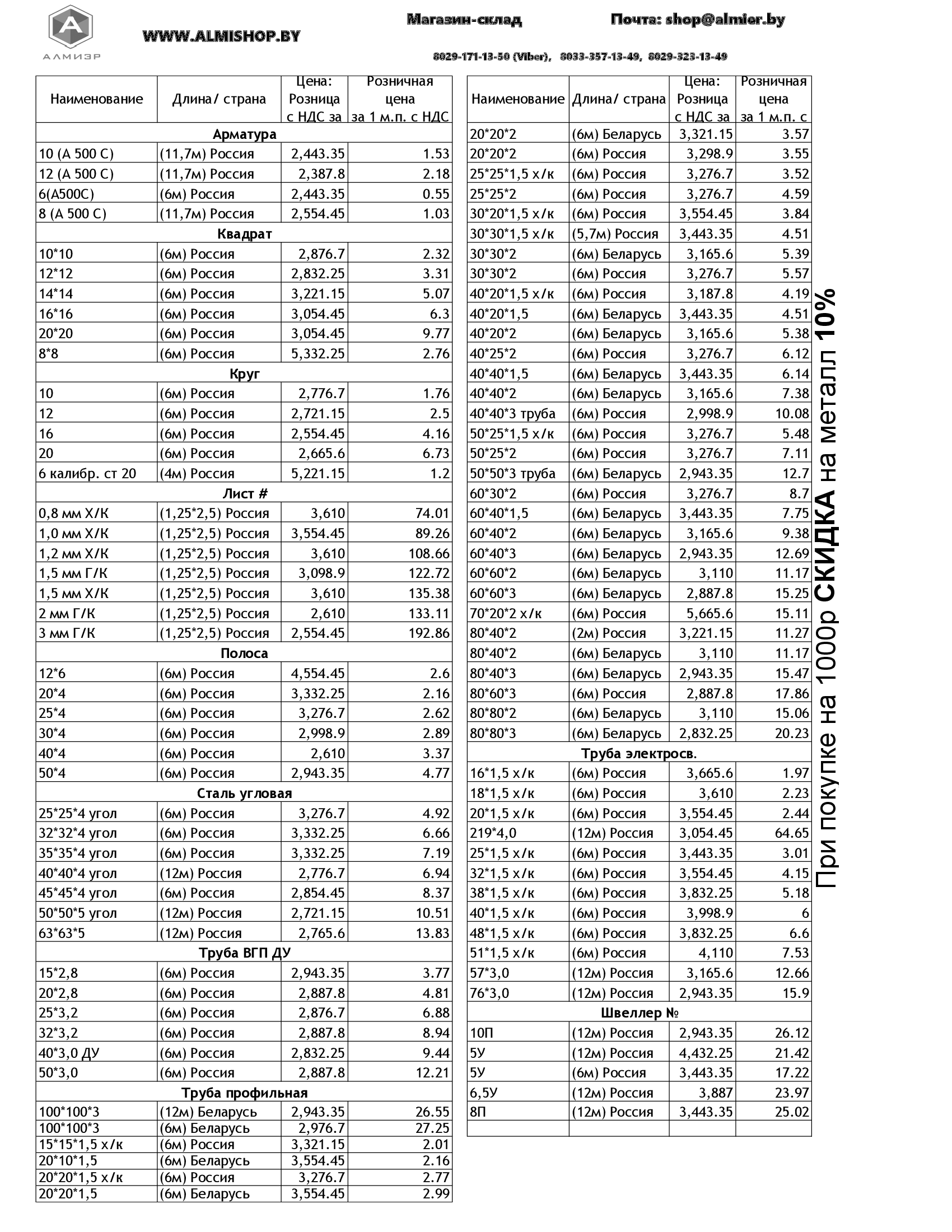 Прайс лист от 10.10.2025 на металлопрокат в магазине Озерцо