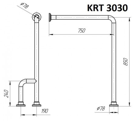 KRT 3030 Поручень напольно-настенный Г-образный (усиленный левый)Труба AISI-304 Ø42,4 ммВнешние размеры: глубина75см, высота 85смВес 3кг